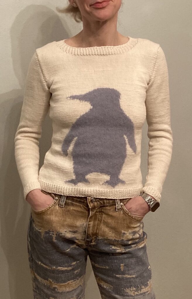 Der Pinguinpulli. Abgeschaut von einem Modell von Guess, das mir farblich nicht gefallen hat. Der Entwurf wurde dann großartig von der genialen Strickerin Eva umgesetzt. Die Laufentenschürze!Florales ViskosekleidZweiteiler aus StrickstoffAfghanisches Kleid I
